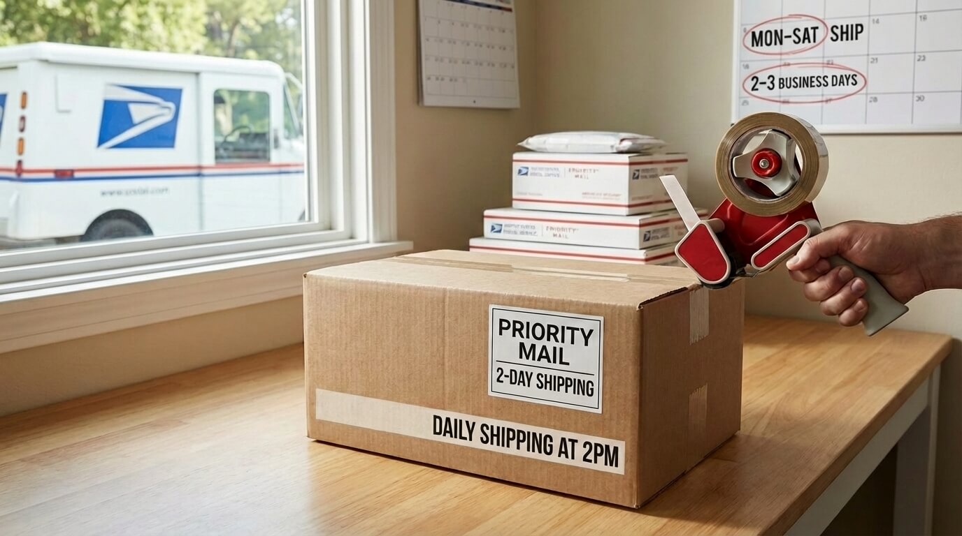 We ship every single order with USPS Priority, which is typically 2–3 business days once it leaves our hands. We send out all orders daily at 2PM Monday through Saturday, so we do our part fast! Every now and then a local USPS facility might cause a small delay, but honestly that doesn’t happen very often.