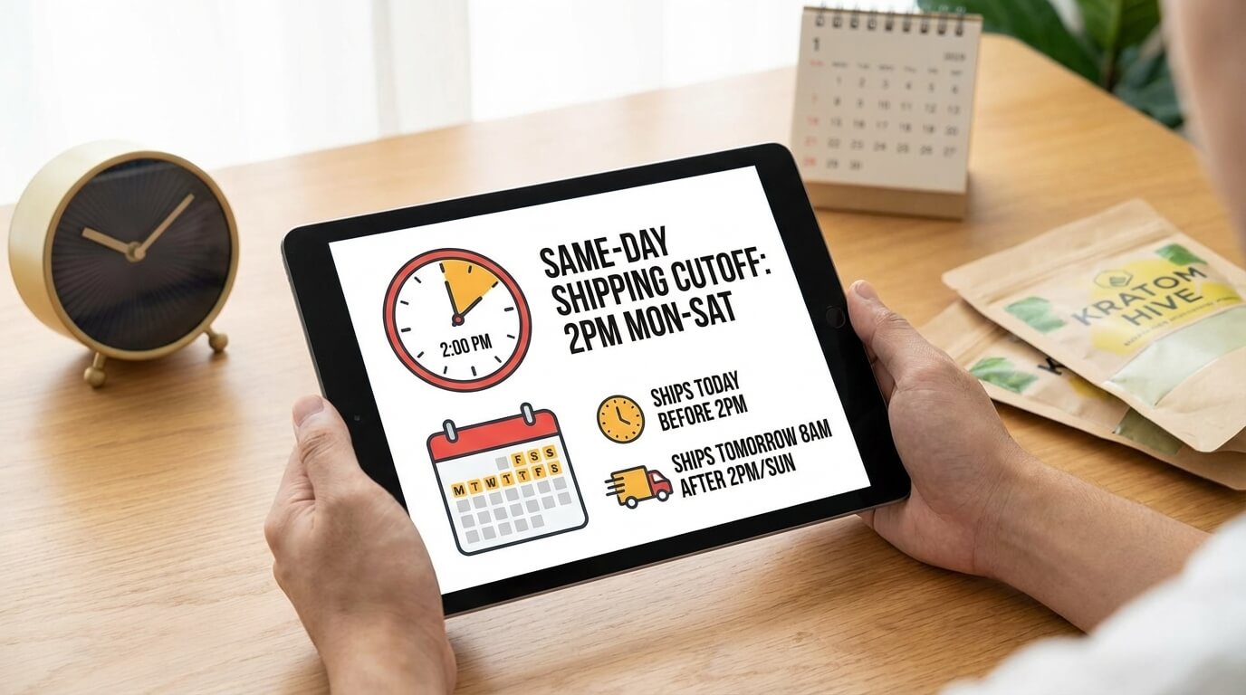 If you order before 2PM Monday through Saturday, we ship it that same day! If it’s after 2PM or it’s a Sunday, no worries — your order goes out the very next morning at 8AM sharp. We never sit on orders, we know you’re excited to get your kratom and we want it at your door as fast as possible.
